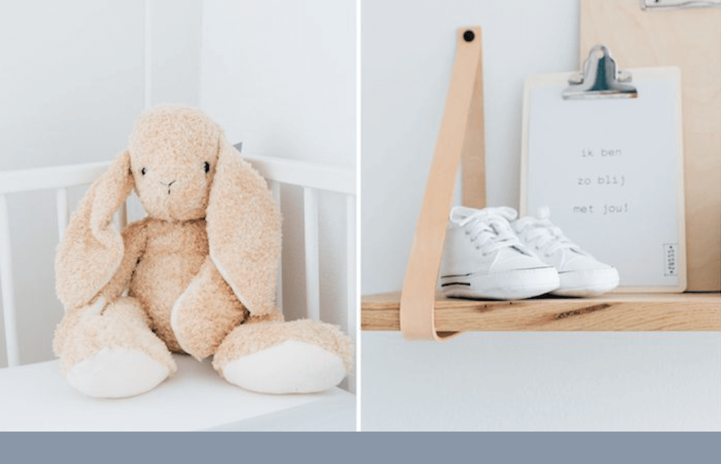 Boven de commode hangt een geschaafde eikenhouten plank met leren plankendragers van Handles & More.